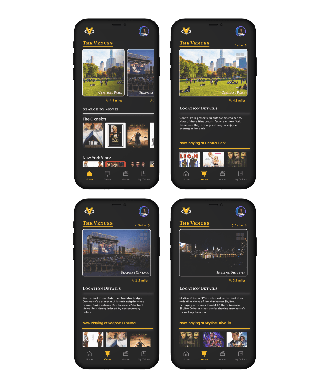 VENUE is a mobile app that allows users to explore and reserve tickets to outdoor movie venues. The app aims to compile independent outdoor movie cinemas all in one, easy to use app.