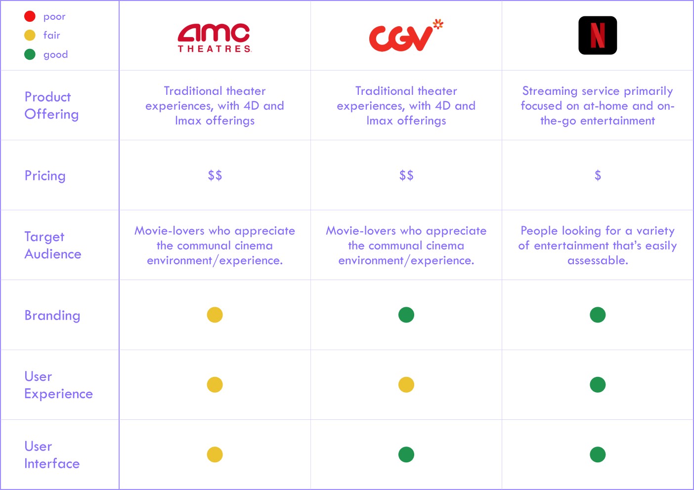 The ticketing flow was observed with two traditional theater chains. It was decided to include the most prominent streaming service in order to understand the UI and search/browsing elements being used.